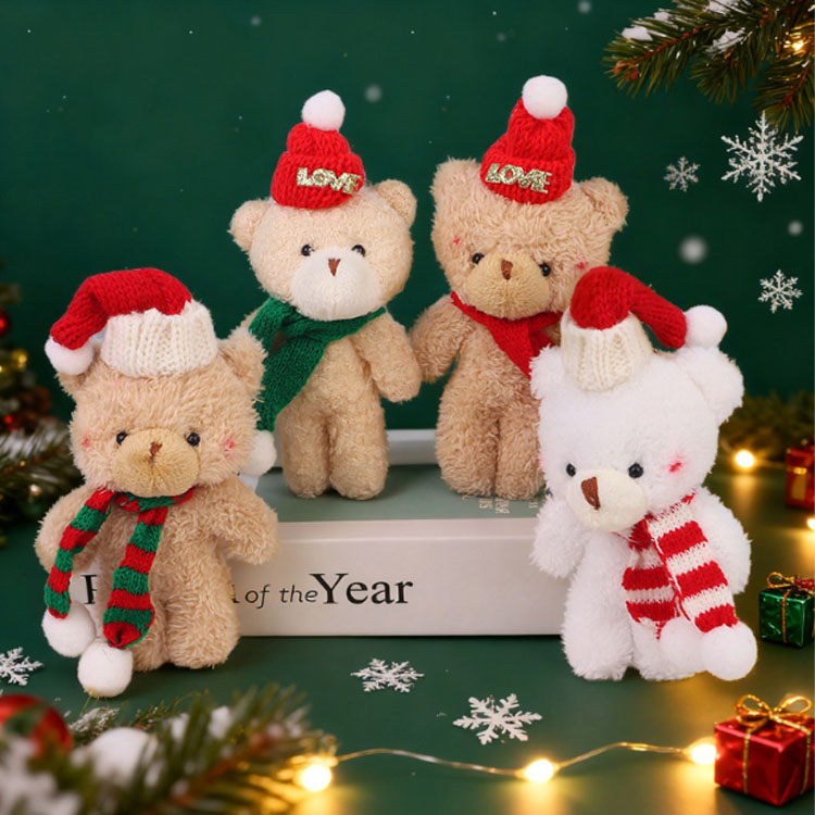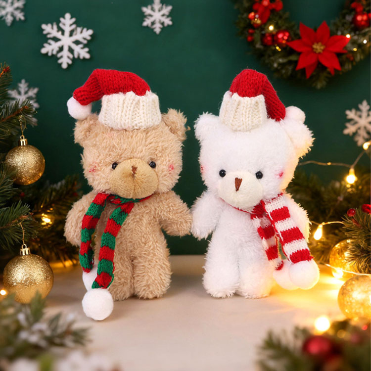 Αυτό το χριστουγεννιάτικο γεμιστό παιχνίδι έχει τη μορφή ενός αρκουδάκι, έχει δύο διαφορετικά υλικά, δηλαδή βελούδινα και αρσενικά fleece. Η γούνα του Teddy Fleece είναι ελαφρώς σγουρή. Και τα δύο υλικά έχουν μια ομαλή και μαλακή υφή και είναι πολύ ελαφριά. Η αρκούδα Teddy Fleece έρχεται σε δύο χρώματα: ανοιχτό καφέ και σκούρο καφέ. Η βελούδινα αρκούδα έχει επίσης δύο χρώματα: καφέ και λευκό. Κάθε αρκούδα συνδυάζεται με ένα διαφορετικό κασκόλ και κάθε αρκούδα φοράει κόκκινο καπέλο Χριστουγέννων, προσθέτοντας μια εορταστική πινελιά. Τα κασκόλ και τα καπέλα των αρκούδων είναι πλεκτά και είναι διακοσμημένα με λευκές πομπές, φαίνονται πολύ ευαίσθητα. Τα μάτια της αρκούδας είναι μαύρα και τα μάγουλά του είναι διακεκομμένα με κοκκινίσματα, καθιστώντας το πολύ χαριτωμένο. Η εμφάνισή του έχει κερδίσει την αγάπη πολλών πελατών.