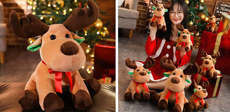 Τα βελούδινα παιχνίδια ταράνδων έρχονται σε τρία μεγέθη: 25 cm, 35 cm και 45 cm. Αυτό το καθιστά εξαιρετικά πρακτικό και διακοσμητικό, επιτρέποντας την εύκολη επιλογή με βάση τις ανάγκες σας. Τα μικρότερα μπορούν να χρησιμοποιηθούν για τη διακόσμηση αυτοκινήτων και χριστουγεννιάτικων δέντρων. Οι μεγαλύτερες μπορούν να τοποθετηθούν στο κρεβάτι ενός δωματίου, σε καναπέ ή βιβλιοθήκη, και μπορούν επίσης να δοθούν ως δώρο Χριστουγέννων σε φίλους.