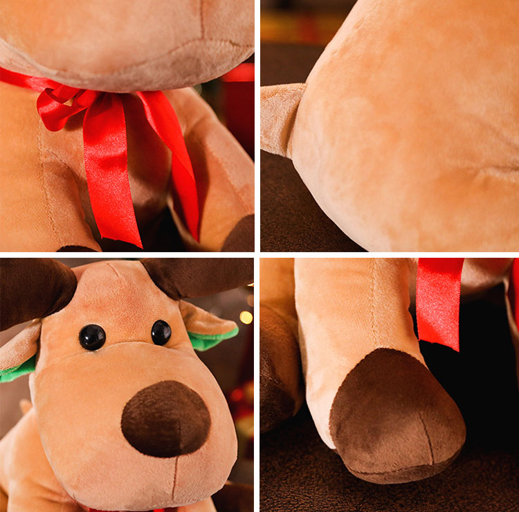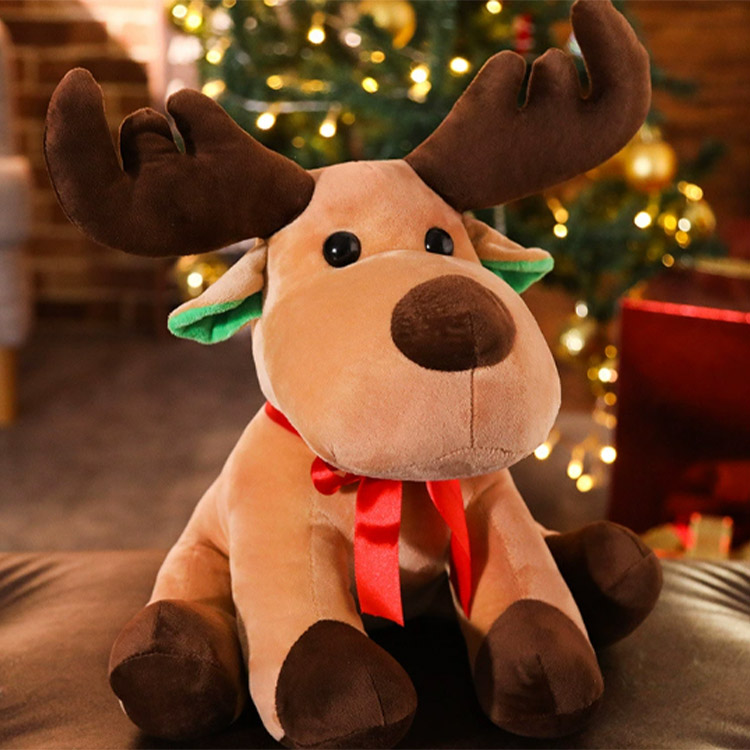 Αυτό το βελούδινο παιχνίδι των τάρανδων είναι σε πολύ ζεστό ανοιχτό καφέ χρώμα. Το ζευγάρι καφέ κέρατα στο κεφάλι του είναι πολύ χαριτωμένο και υπερβολικό. Τα στρογγυλά μαύρα μάτια του, η σκούρα καφέ μύτη και οι πράσινες προθέσεις μέσα στα αυτιά του δίνουν μια κομψή και τρισδιάστατη εμφάνιση. Το λαμπερό κόκκινο τόξο που δεμένο γύρω από το λαιμό του προσθέτει στην εορταστική ατμόσφαιρα. Η μαλακή εμφάνιση αυτού του μικρού ελάφι κάνει κάποιον να αισθάνεται αμέσως χαρούμενη κατά τη διάρκεια της περιόδου των διακοπών, σαν να μπορούσε να σας φέρει ένα δώρο ανά πάσα στιγμή.